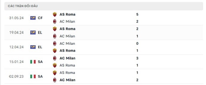 Bảng bóng đá trận đấu AC Milan vs AS Roma