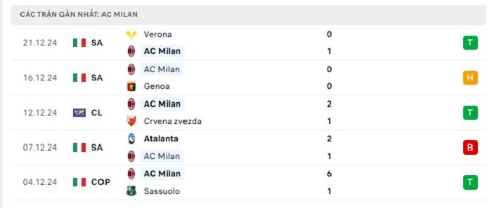 Phong độ gần đây AC Milan vs AS Roma
