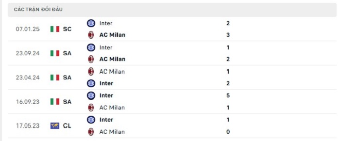 Bảng bóng đá trận đấu AC Milan vs Inter Milan