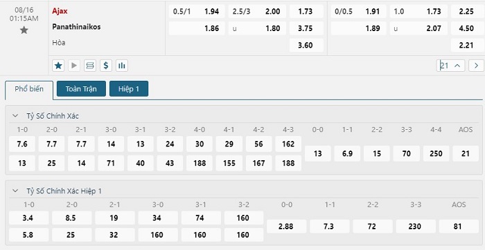 Bảng tỷ lệ kèo bóng đá trận đấu Ajax Amsterdam vs Panathinaikos