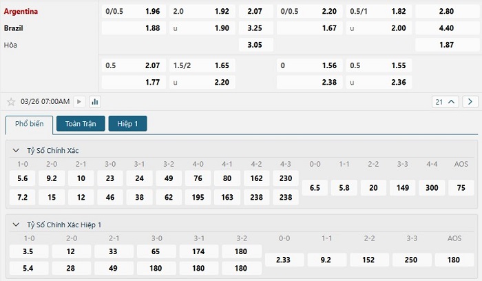 Bảng tỷ lệ kèo bóng đá trận đấu Argentina vs Brazil