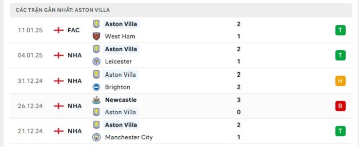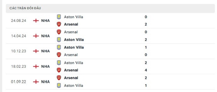Lịch sử đối đầu của Arsenal vs Aston Villa
