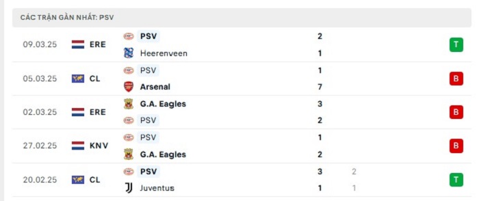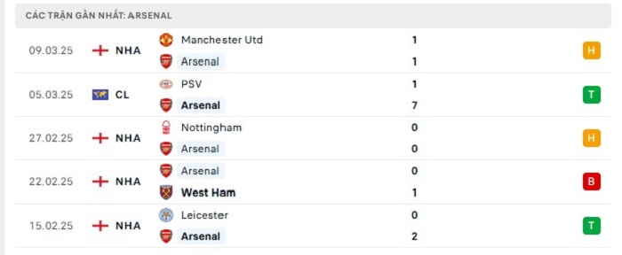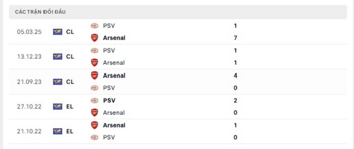 Phong độ gần đây Arsenal vs PSV Eindhoven