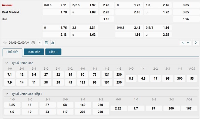 Bảng tỷ lệ kèo bóng đá trận đấu Arsenal vs Real Madrid