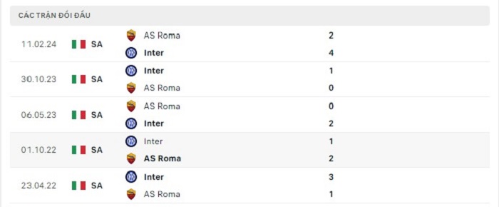 Bảng bóng đá trận đấu AS Roma vs Inter Milan