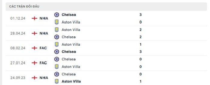 Bảng bóng đá trận đấu Aston Villa vs Chelsea