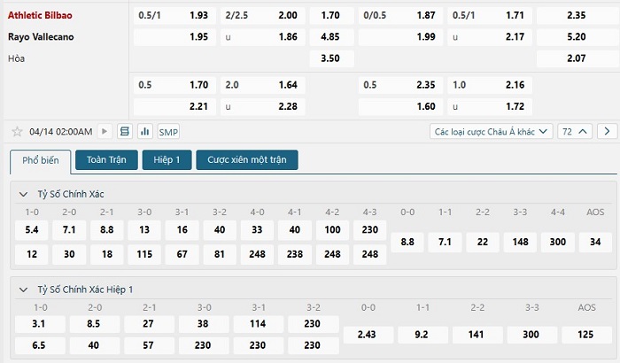 Bảng tỷ lệ kèo bóng đá trận đấu Athletic Bilbao vs Rayo Vallecano