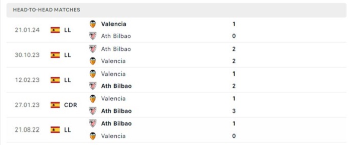 Phong độ gần đây Athletic Bilbao vs Valencia