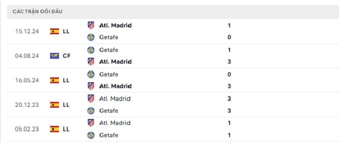 Lịch sử đối đầu của Atletico Madrid vs Getafe