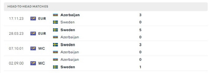 Ở những lần gặp nhau gần đây của Azerbaijan và Thụy Điển cũng đã cho thấy được lối chơi đầy phóng thoáng của hai đội khi thường xuyên xuất hiện rất nhiều bàn thắng ghi được. Cụ thể là có tới 3 trong 4 lần gặp nhau có từ 3 bàn thắng ghi được trở lên cho cả hai đội trong trận. Thụy Điển vốn vẫn là cái tên đang thể hiện lối chơi cũng không thực sự chắc chắn như trước do vậy mà tỷ số trận đấu giữa hai đội hoàn toàn có thể tiếp tục xuất hiện nhiều trong trận.