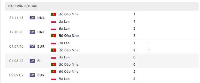 Bảng bóng đá trận đấu Ba Lan vs Bồ Đào Nha