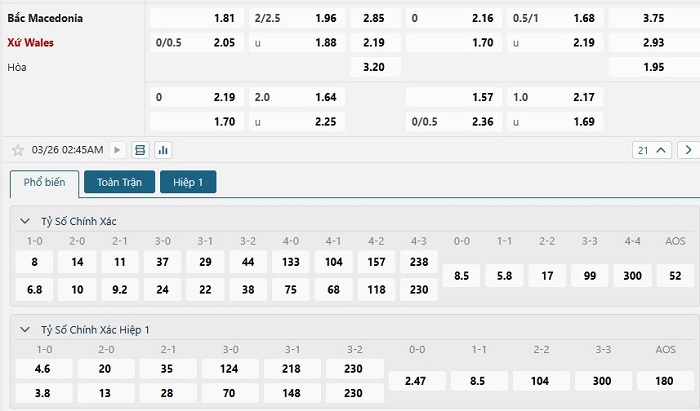 Bảng tỷ lệ kèo bóng đá trận đấu Bắc Macedonia vs Wales