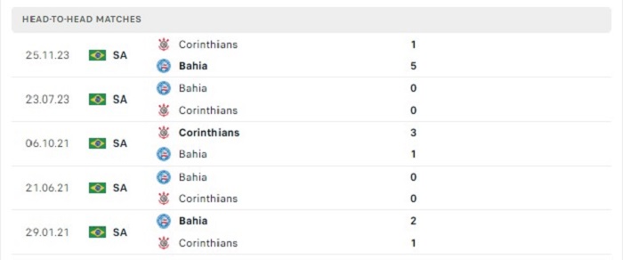 Những trận gặp nhau của hai đội trước đây vốn cũng thường diễn ra kịch tính và hấp dẫn với nhiều bàn thắng ghi được trong trận, bằng chứng là 7 trong 10 lần gặp nhau đã xuất hiện từ 3 bàn thắng ghi được trở lên trong trận đấu, Bahia thể hiện được hiệu quả trong việc ghi bàn trên sân nhà thì Corinthians lại thi đấu không chắc chắn trên sân khách, do đó mà tỷ số trận đấu sắp tới hoàn toàn có thể tiếp tục xuất hiện nhiều trong trận.