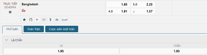 Bảng tỷ lệ kèo bóng đá trận đấu Bangladesh vs Úc