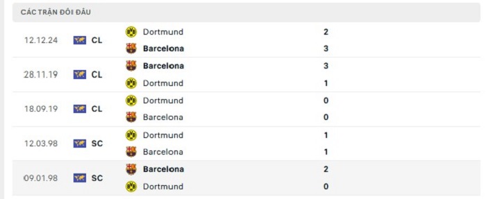 Quá khứ vẫn đang đứng về phía Barcelona trong những lần gặp Borussia Dortmund trước đây, điều này cũng được thể hiện trong quá khứ khi đại diện Tây Ban Nha có thành tích bất bại trước đối thủ này, trong 5 lần gặp nhau trước đây Barcelona có thành tích thắng 3 và hoà 2 theo kèo châu Âu trước Borussia Dortmund cũng đã cho thấy những thành công đáng kể của họ, do vậy mà có thể kỳ vọng tới một chiến thắng theo kèo châu Âu của đội chủ nhà ở trận đấu sắp tới đây.