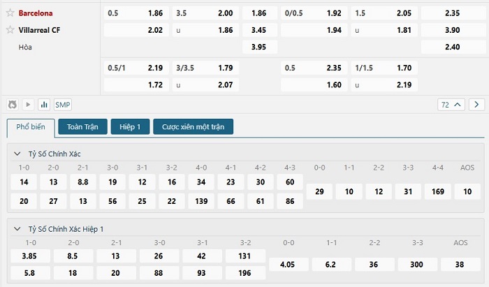 Bảng tỷ lệ kèo bóng đá trận đấu Barcelona vs Villarreal
