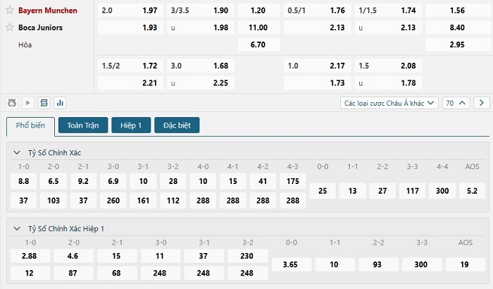 Bảng tỷ lệ kèo bóng đá trận đấu Bayern Munich vs Boca Juniors