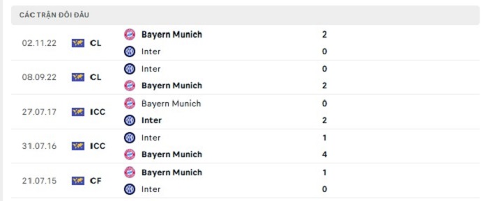 Phong độ gần đây Bayern Munich vs Inter Milan