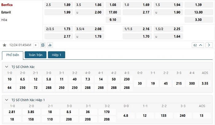 Soi kèo châu Á, kèo chấp Benfica vs Estoril