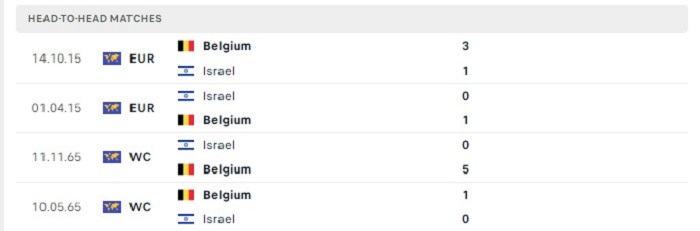 Trong tổng cộng 4 lần gặp nhau trước đây của hai đội thì Bỉ toàn thắng theo kèo châu Âu cả trận trước Israel, điều này không những phản ánh về sự chênh lệch của hai đội về mặt chuyên môn cũng nhưng chất lượng về mặt đội hình giữa hai đội. Hơn nữa với tuyển Bỉ họ cũng đang có được những thành công rất lớn trên sân nhà của mình khi có được những kết quả tốt hơn, chính bởi lý do này mà có thể đặt niềm tin vào Bỉ trên phương diện của kèo châu Âu tại trận đấu.