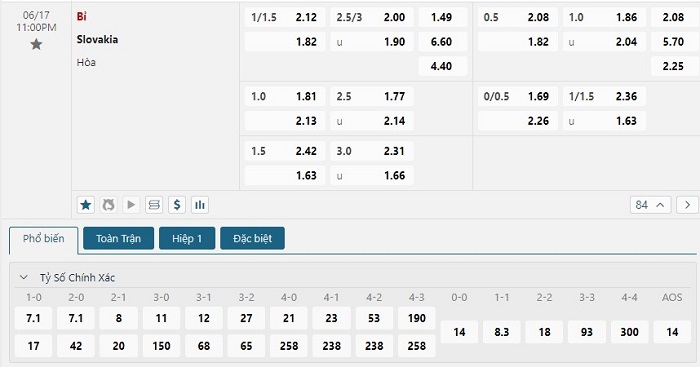 Bảng tỷ lệ kèo bóng đá trận đấu Bỉ vs Slovakia