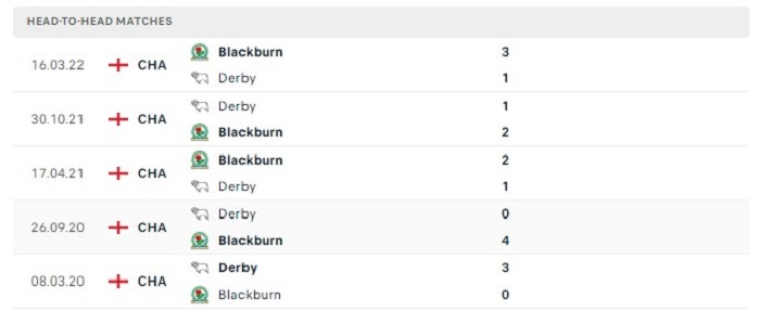 Thống kê có thể thấy được những lần gặp nhau gần đây của Blackburn Rovers và Derby County có được tỷ lệ ghi bàn tương đối cao khi 5 trận gần nhất đều có từ 3 bàn trở lên, trong đó Blackburn Rovers có được 2 chiến thắng với tỷ số 2-1 chung cuộc trước đối thủ này cho thấy được thực lực và hiệu quả ghi bàn của họ, vì vậy mà tỷ số trận đấu sắp tới giữa Blackburn Rovers và Derby County hoàn toàn có thể tiếp tục lặp lại như trước.