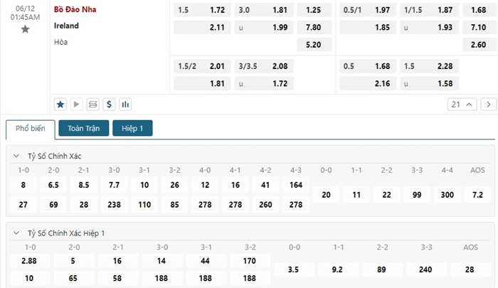 Bảng tỷ lệ kèo bóng đá trận đấu Bồ Đào Nha vs Ireland