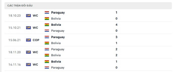 Bảng  bóng đá trận đấu Bolivia vs Paraguay