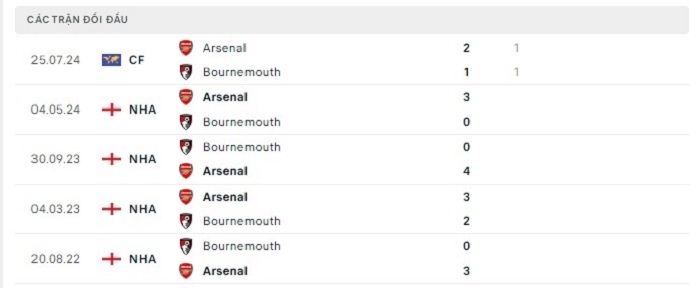 Bảng  bóng đá trận đấu Bournemouth vs Arsenal