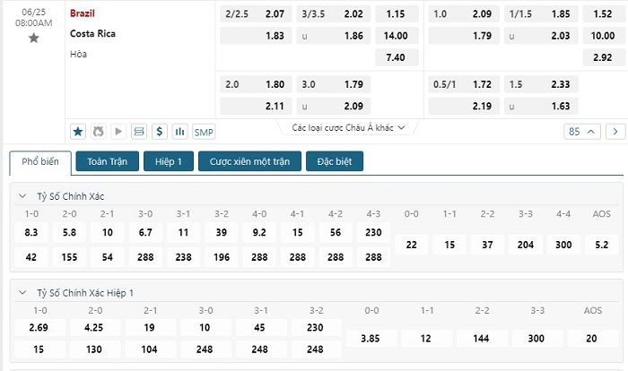 Bảng tỷ lệ kèo bóng đá trận đấu Brazil vs Costa Rica