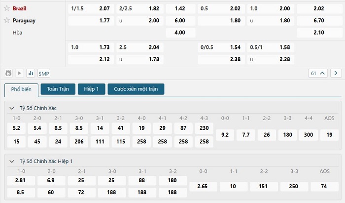 Bảng tỷ lệ kèo bóng đá trận đấu Brazil vs Paraguay
