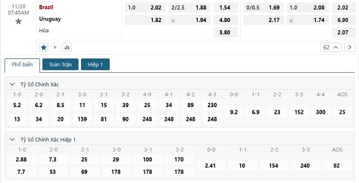 Soi kèo tỷ số Brazil vs Uruguay
