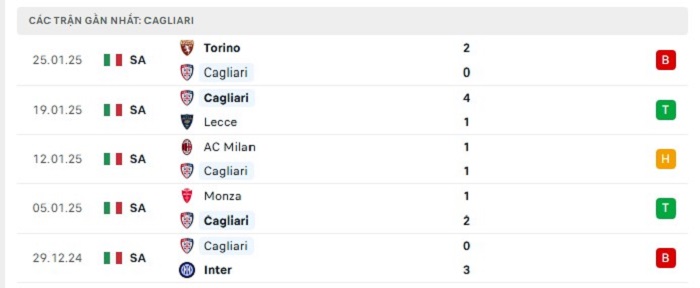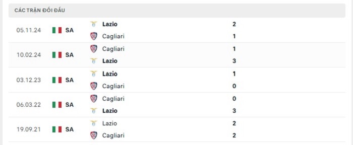Bảng  bóng đá trận đấu Cagliari vs Lazio