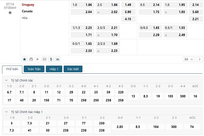 Bảng tỷ lệ kèo bóng đá trận đấu Canada vs Uruguay