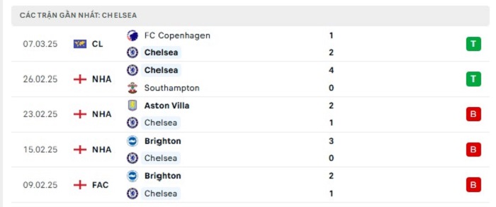 Phong độ gần đây Chelsea vs Leicester City