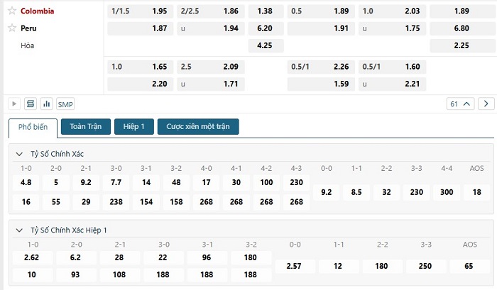 Bảng tỷ lệ kèo bóng đá trận đấu Colombia vs Peru