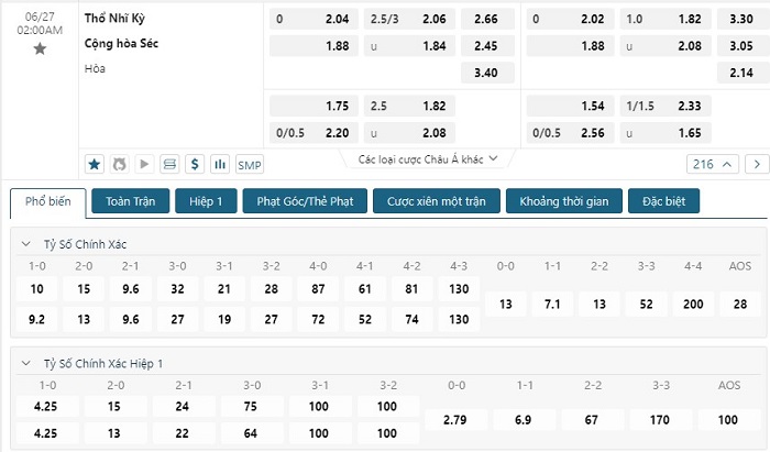 Bảng tỷ lệ kèo bóng đá trận đấu Cộng hoà Séc vs Thổ Nhĩ Kỳ