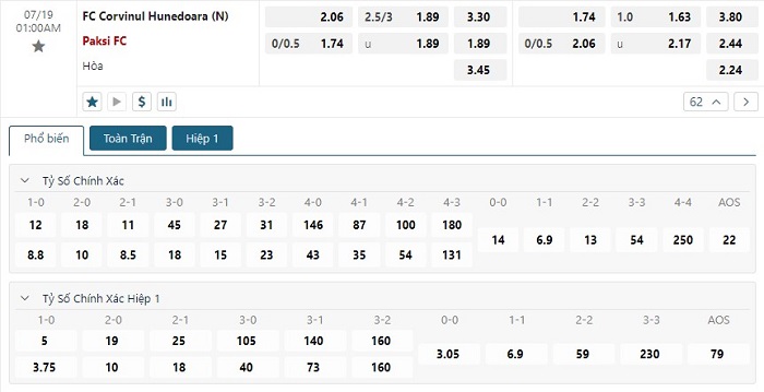 Bảng tỷ lệ kèo bóng đá trận đấu Corvinul Hunedoara vs Paksi SE