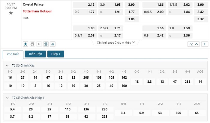 Trong quá khứ Tottenham cũng có thể thấy được là một cái tên thực sự khó chơi với Crystal Palace, cụ thể là 10 trận gặp nhau trước đây của hai đội Crystal Palace cũng chỉ thắng kèo châu Âu được 1 trận đấu và 2 trận hoà trong khi có tới 7 lần phải nếm mùi thất bại. Trong những trận derby thành phố London thì thực lực của Tottenham vẫn được đánh giá cao hơn nhiều so với Crystal Palace, do vậy mà có thể đặt niềm tin vào đội khách theo mốc kèo châu Âu của trận đấu.