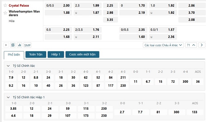 Bảng tỷ lệ kèo bóng đá trận đấu Crystal Palace vs Wolves