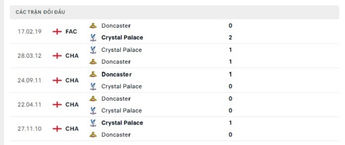 Thống kê trong quá khứ những trận gặp nhau giữa Doncaster Rovers và Crystal Palace vốn cũng không có quá nhiều bàn thắng ghi được, cụ thể là cả 5 lần gặp nhau gần đây của hai đội cũng chỉ xuất hiện tỷ số ghi được từ 2 bàn trở xuống. Ở sân chơi Cúp FA này với Crystal Palace họ cũng không quá bung sức của mình trước các đối thủ bị đánh giá yếu hơn ở giải đấu, do vậy mà khó có thể kỳ vọng tới một trận đấu bùng nổ về mặt tỷ số cho cả hai đội.