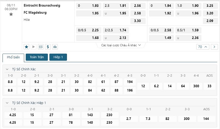 Bảng tỷ lệ kèo bóng đá trận đấu Eintracht Braunschweig vs FC Magdeburg