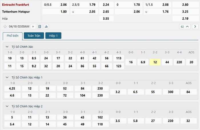 Bảng tỷ lệ kèo bóng đá trận đấu Eintracht Frankfurt vs Tottenham