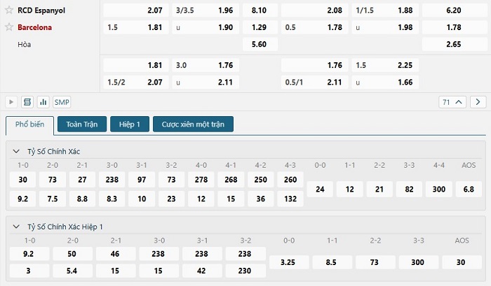 Bảng tỷ lệ kèo bóng đá trận đấu Espanyol vs Barcelona