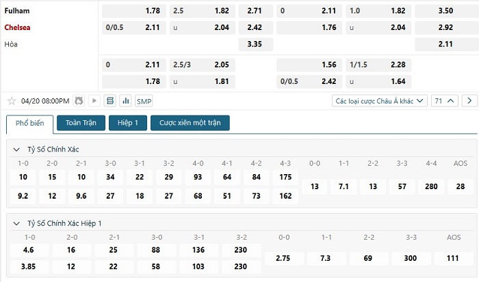 Bảng tỷ lệ kèo bóng đá trận đấu Fulham vs Chelsea