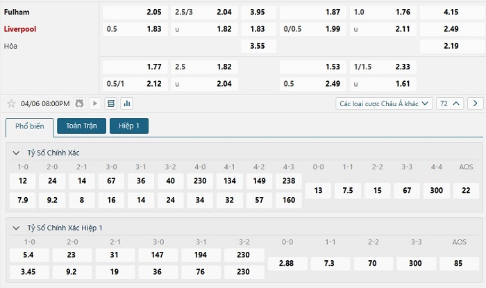 Bảng tỷ lệ kèo bóng đá trận đấu Fulham vs Liverpool