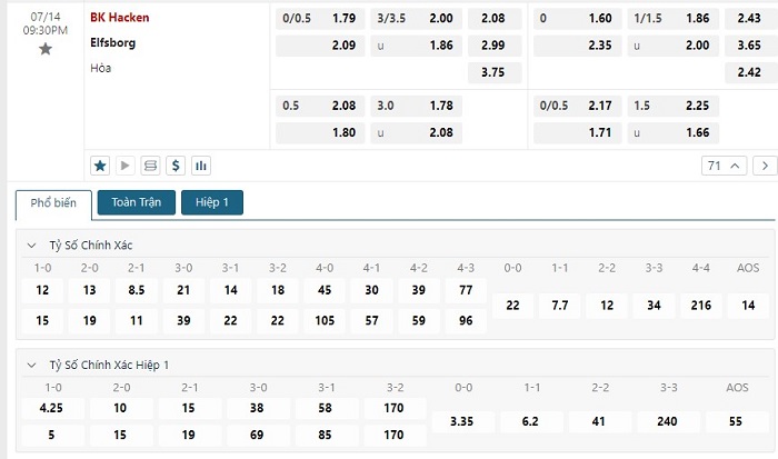 Bảng tỷ lệ kèo bóng đá trận đấu Hacken vs Elfsborg