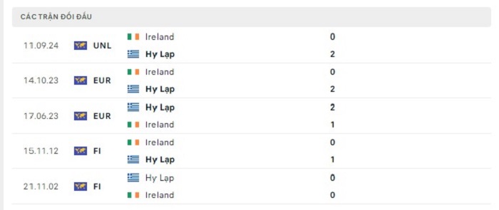 Thành tích quá khứ của hai đội cũng có thể thấy được những thành công của Hy Lạp trước Ireland, cụ thể là 5 lần gặp nhau trước đây của hai đội Hy Lạp vẫn đang duy trì được thành tích bất bại trước Ireland trong đó thu về được 3 chiến thắng theo mốc kèo châu Âu của trận đấu, điều này cũng có thể nhận thấy được những thành công ấn tượng của mình trước Ireland trong nhiều năm qua, bởi vậy mà khả năng thắng trận của đội chủ nhà cũng là khả quan hơn nhiều.