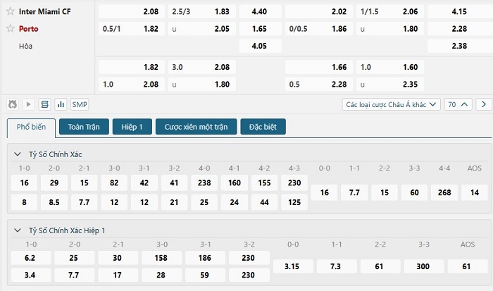 Bảng tỷ lệ kèo bóng đá trận đấu Inter Miami vs FC Porto