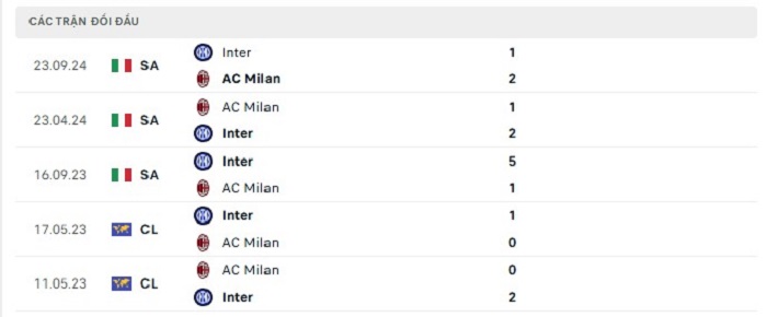 Bảng bóng đá trận đấu Inter Milan vs AC Milan